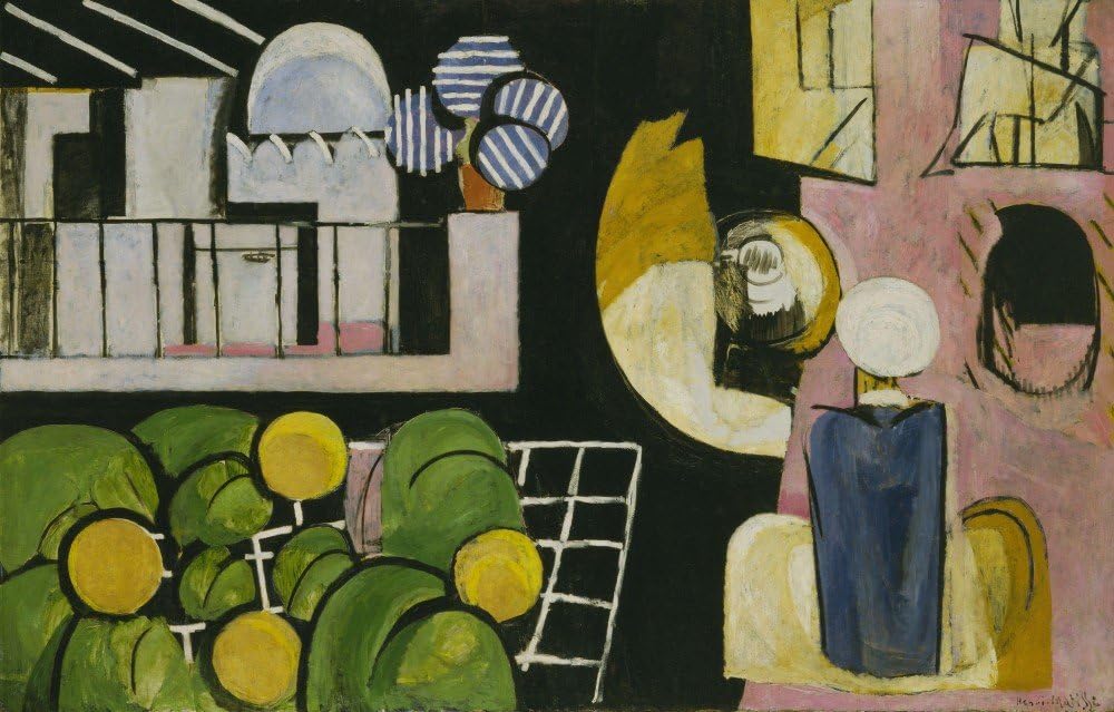 La Grande guerre éclate en 1914, et Matisse ainsi que son œuvre en seront profondément marqués. Le période 1914-1916 est probablement la période la plus sombre de l’œuvre de l’artiste. Ses compositions auparavant si colorées se parent de noir, comme s’il s’agissait d’un voile, ses toiles portent le deuil. Pendant ces deux ans, Matisse se rapproche des cubistes (de Juan Gris notamment) et son art se métamorphose profondément, le peintre pousse sa tendance picturale de la simplification et du symbole à l’extrême et ses tableaux deviennent pures représentations géométriques et pures couleurs.