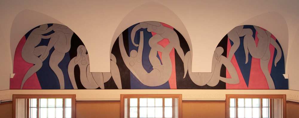 Dans le premier tableau, on reconnait la composition au troisième plan dans La joie de vivre, mais dont les proportions sont devenues monumentales (260x391cm) : La danse représente une ronde joyeuse entre cinq personnages dont on ne perçoit pas les visages (sauf d’un), et dont la composition rythmée indique qu’ils tournent dans le sens des aiguilles d’une montre. En plus d’être une représentation simple et heureuse, elle aussi métaphorique : la toile représente, plus qu’une farandole, le cours du temps. La vie, tantôt lente, ponctuée d’instants de flottement représentés par les deux personnages de gauche ; tantôt rapide et active (deux personnages de droite). Et parfois, une rupture, un déchirement du rythme de vie (un drame, la mort…) représenté par le personnage au premier plan qui semble trébucher et manquer la main de son compagnon de gauche.